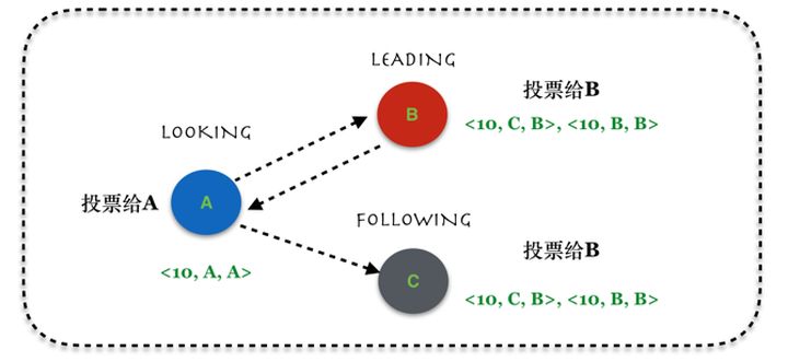 - 这里A和B判断得出C是最合适的Leader,因此A和B都更新自己的候选Leader为C,同时由于C的消息,A和B都更新自身维护的投票信息,增加C的投票信息。