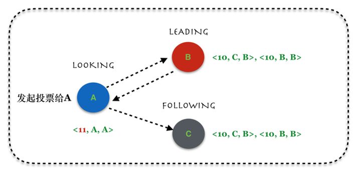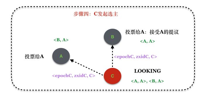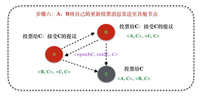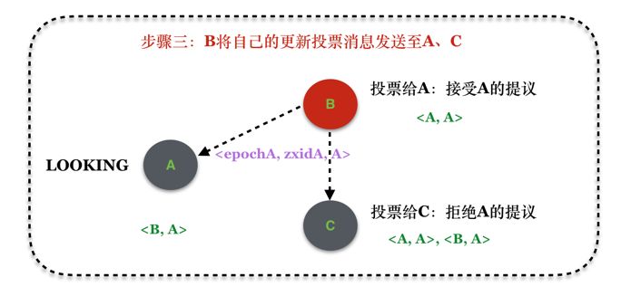 - 因为B更新了自己的投票,从投票给自己变成投票给A,因此根据协议的定义,需要将该消息扩散出去。而C由于拒绝了A的提议,因此,无需扩散消息;
