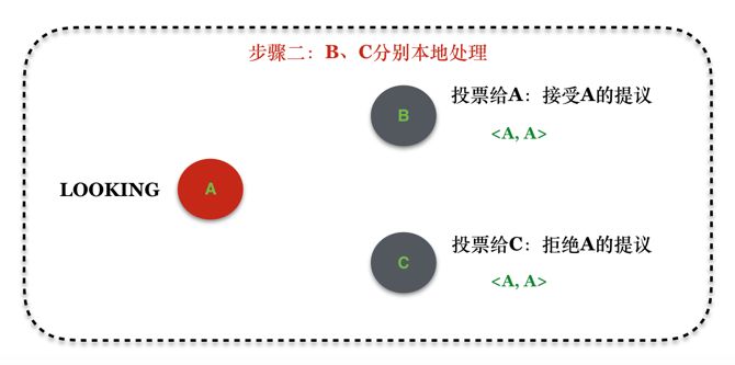 STEP 2:B、C节点处理A的选主消息,其中,B接受A的提议,C拒绝A的提议: