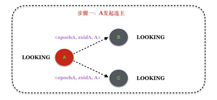 STEP 1:处于LOOKING状态的A发起一次选主请求,并将请求广播至B、C节点,而此时B、C也恰好处于LOOKING状态: