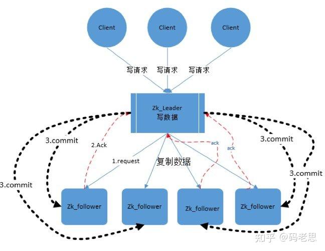 消息广播(boardcast):Zab 协议中,所有的写请求都由 leader 来处理。正常工作状态下,leader 接收请求并通过广播协议来处理。